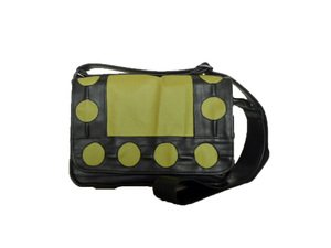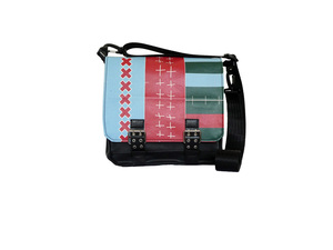 De schouderband is van fietsbinnenband met gerecycled plastic van een krantenbezorgers-fietstas, en heeft een gesp waardoor deze verstelbaar is in lengte. De tas gaat dicht met 2 magneetsluitingen.