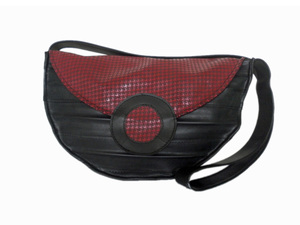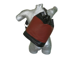 Dit is een monostrap rugzak van gerecycled fietsbinnenbanden in combinatie met bewerktbloedrood leer, die ook als schoudertas gedragen kan worden. De bodem is van tractorbinnenband.