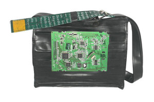 Deze Arti Tas is geïnspireerd op het thema analoog versus digitaal: de voorkant is gedecoreerd met een printplaat van een PC, onder de flap is een vak gemaakt van gerecycled plastic van een krantenbezorgers-fietstas met de namen van verschillende kranten en “komt in de bus!”