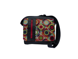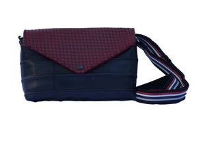 Deze tas is gemaakt van hergebruikte fietsbinnenbanden met een klep van stof met retro print en een zwarte voering.