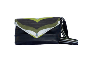 Deze tas is gemaakt van hergebruikte fietsbinnenbanden met een klep van bedrukt leer met een granny kleur voering.