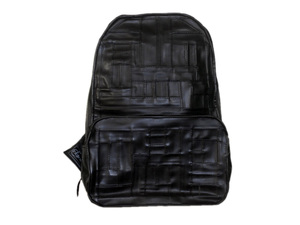Deze rugzak is een Arti Tas die gemaakt is van gerecycled fietsbinnenbanden, een spatlap van Gazelle, een fietshandvat en autobinnenband van het merk Dunlop. Laatst genoemde is zeldzaam en afkomstig van banden van oldtimers. De hedendaagse autoband is namelijk tube-less. De opdruk met de maat van de binnenband is op verschillende plekken verwerkt. Zo ook de plakkers van ‘pech onderweg’